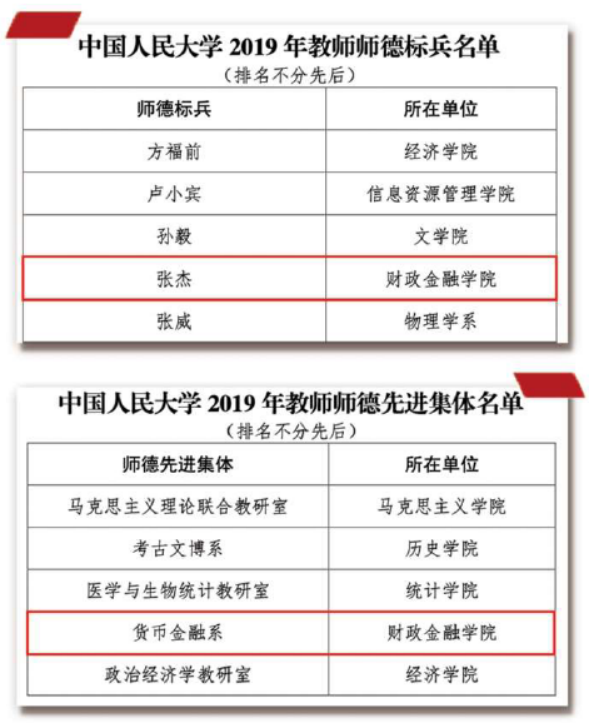 以大师弘大道,以师风促学风,学院坚持师德师风与学术水平并重,用优良的师德师风保障学院事业不断发展。2020年3月25日,货币金融系荣获“色花堂 2019年教师师德先进集体”荣誉称号,张杰教授荣获“色花堂 教师师德标兵”荣誉称号。2019年,学院财政学、金融学专业获评国家级一流本科专业建设点。2020年5月,学院“健全再分配调节机制研究”与“推动建立国际宏观经济政策协调机制研究”荣获国家社科基金重大项目,“现代中央银行制度建设研究”荣获重点项目。