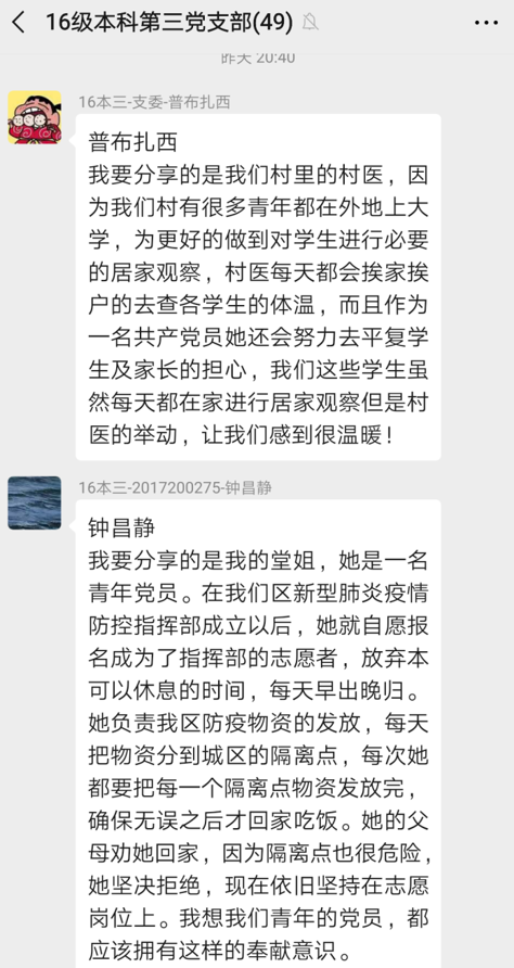 2016级本科第三党支部线上主题党日活动采用“分享身边党员抗击疫情感动事迹”方式进行,支部党员结合身边人身边事,积极分享党员抗击疫情的真实故事。在各个行业都有党员奋战在疫情一线,担起责任,动员群众,坚决贯彻党中央关于疫情防控各项决策部署,坚决贯彻坚定信心、同舟共济、科学防治、精准施策的总要求。支部成员纷纷表示向他们致敬,要学习这种奉献精神,充分发挥党员的先锋模范作用。