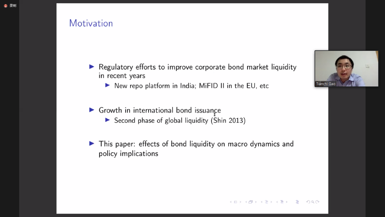 色花堂 高添驰助理教授分享了题为“A Macroeconomic Model with Bond Liquidity”的论文。文章考虑了一个债券可以用作金融流动性的两国宏观模型。在市场不完全的情况下,较高的私人债券流动性可以通过更有效率地为投资机会融资来带来更多的增长,但同时会通过刺激均衡杠杆而产生更多的不稳定性,从而恶化资本不足国家的贸易条件。数值模拟表明,不稳定带来的福利成本可能超过较高增长带来的收益。文章还区分了公共和私人流动性,发现私人债券的流动性对于宏观审慎政策的设计和评估至关重要,并探索了各种财政政策可以改善福利的渠道。