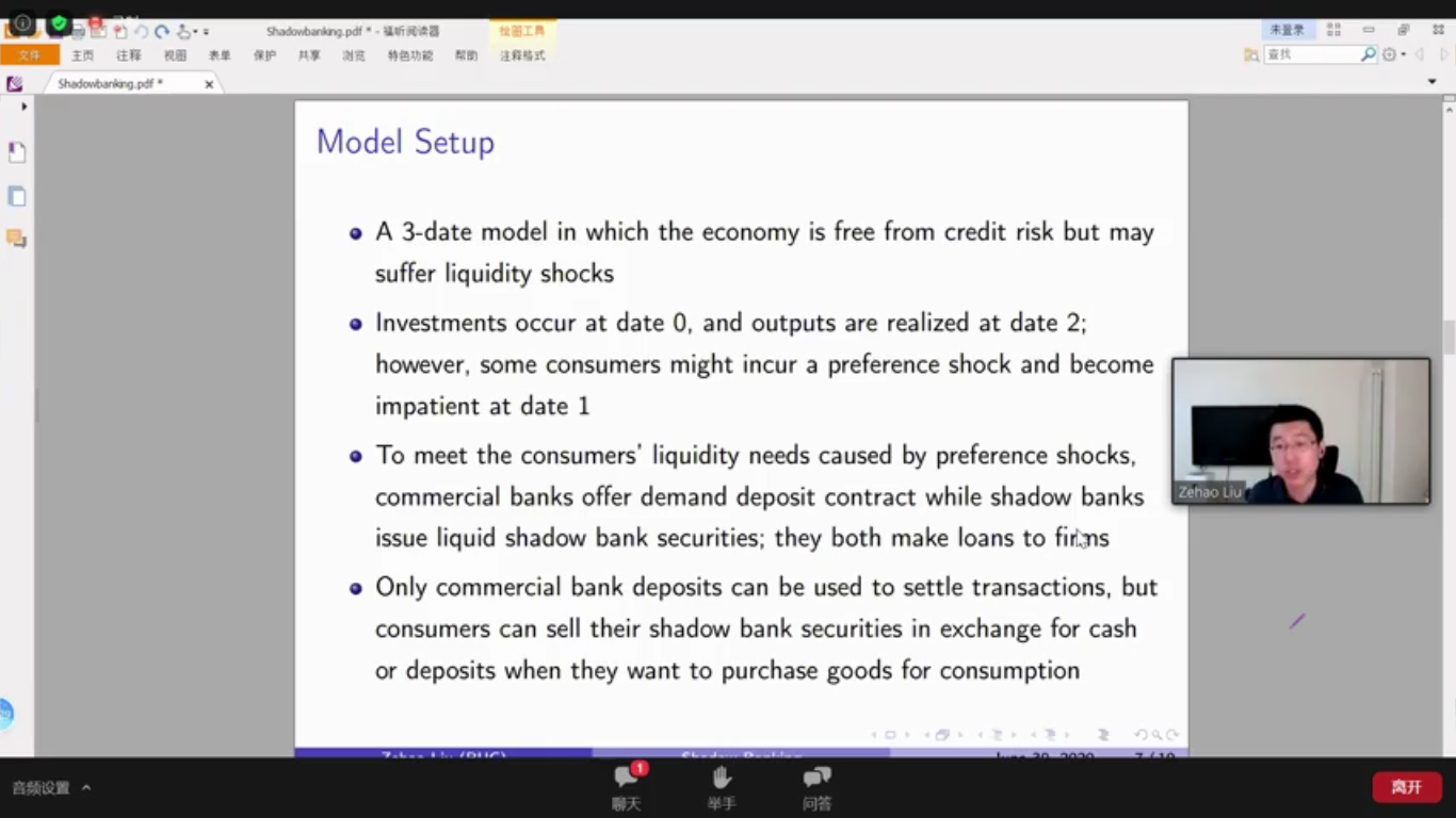 色花堂 刘泽豪助理教授分享的论文“In the Shadow of Shadow Banking: A Liquidity View”研究了影子银行在具有外部货币和内部货币的经济中的流动性作用。将影子银行引入经济会降低以现金和存款总和衡量的货币供应量,而由于影子银行负债具有流动性,支付流动性可能不会减少。由于影子银行在不受流动性法规限制的情况下向企业提供贷款,因此企业可获得的信贷总量增加。影子银行的存在提高了信贷流动性与支付流动性的比率,从而加剧了流动性短缺并导致了过度投资的问题。影子银行负债的流动性的改善可能加剧或缓解过度投资的问题,具体取决于流动性监管的严格程度。