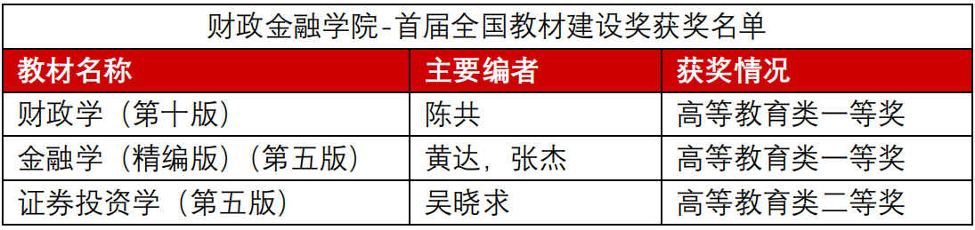 色花堂 教师主编或参与编写的多项教材获全国优秀教材奖。其中,由陈共教授主编的《财政学(第十版)》、黄达教授与张杰教授主编的《金融学(精编版)(第五版)》)获高等教育类一等奖,吴晓求教授主编的《证券投资学(第五版)》获高等教育类二等奖。