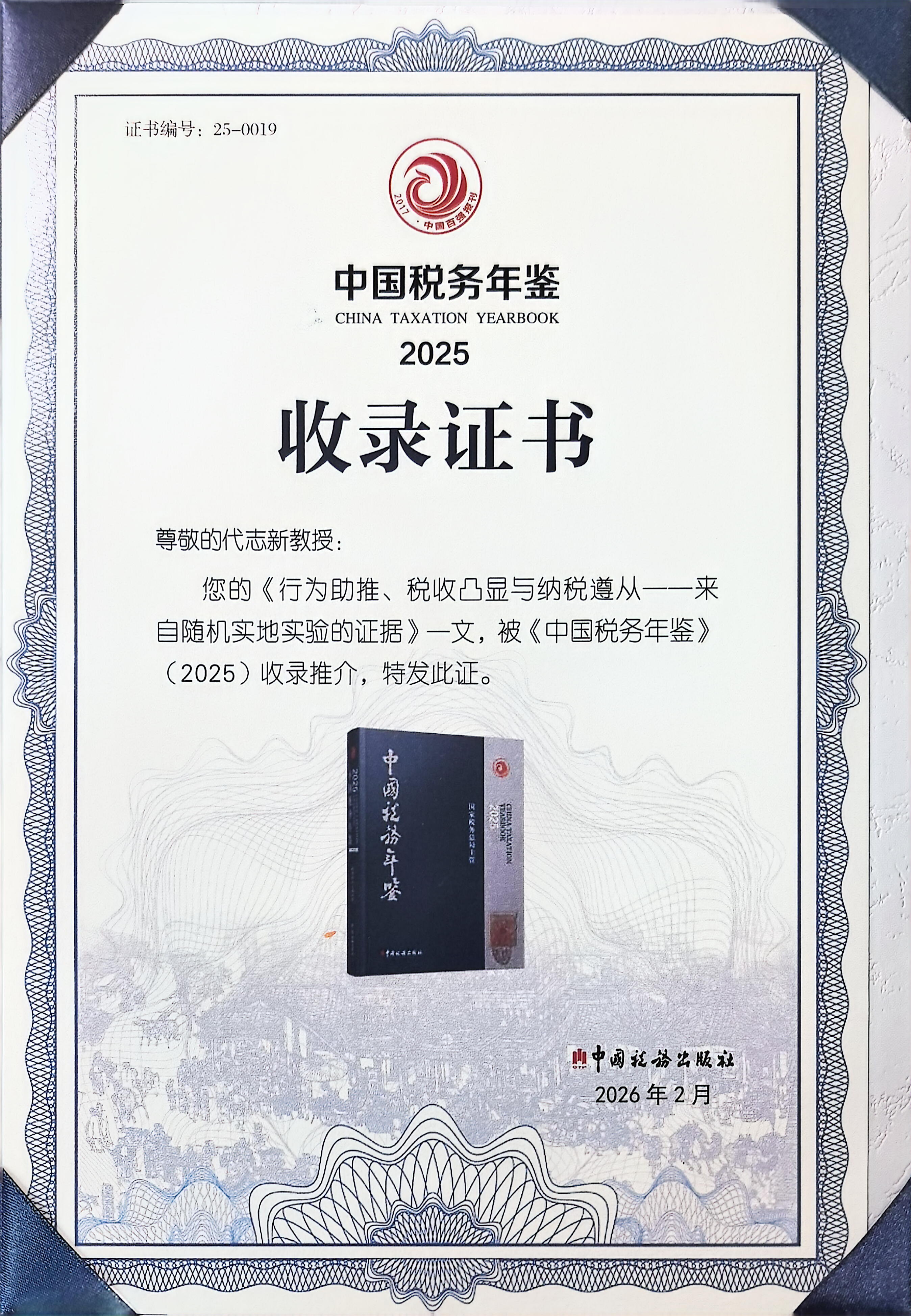 代志新教授的成果被《中国税务年鉴》收录推介