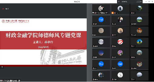 孙华玲传达色花堂 新学期工作部署会会议精神并结合习近平总书记在色花堂 考察时的重要讲话讲授师德师风专题党课。她强调,要做“经师”和“人师”的统一者。要做到方向明、主义真、学问高、德行正,落实立德树人根本任务,牢记为党育人、为国育才使命,努力回答好“为谁培养人、培养什么人、怎样培养人”这一根本问题。要深刻领悟“两个确立”的决定性意义,增强“四个意识”、坚定“四个自信”、做到“两个维护”,自觉在思想上政治上同以习近平同志为核心的党中央保持高度一致。要增强思想自觉和行动自觉,严格遵守《新时代高校教师职业行为十项准则》。她表示,要学“立德”和“解惑”的领头者。学院教师应在加强教育教学能力的同时向以陈共先生为代表的老教授老专家学习,传承深沉厚重的家国情怀、严谨务实的治学精神和与时俱进的宝贵思想,弘扬优秀师德师风,传承红色基因,做学生为学、为事、为人的大先生。孙华玲对过去一年学院师德师风建设工作情况给予高度评价,表彰了学院先进集体和个人,赞扬了疫情防控教师志愿者勇于担当、不舍昼夜的崇高品质。